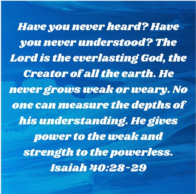 Of course, I know that the Lord is an everlasting God. At least my mind does. I need to get that truth into my heart. I know that He never is weak or weary, but it’s hard for my mind to comprehend that, especially since I feel weak and tired a lot lately. God understands everything, and yet I sometimes fail to trust in His love and comprehension of all things that are coming at me. He will give me power this year, power to face whatever I have to face and the strength to get through it. That is very significant for me since I am facing surgery, the same kind of surgery that my friend Barbara died from. So, there is it…the face in the mirror is not as strong as I want to be but I am not as weak as I thought because I have God beside me.
