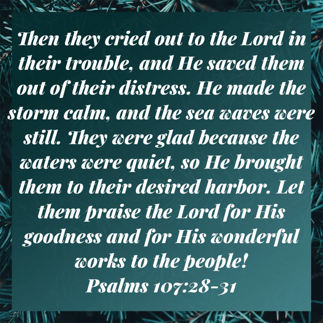 These verses seem to have been written for such a time as this. We are all caught up in a stormy sea. But God is still good and is still working on our behalf. Instead of looking at the stormy sea, we need to keep our eyes on Him. For my part, I am praying and praising and praying some more. I am also looking for good news where I can find it.