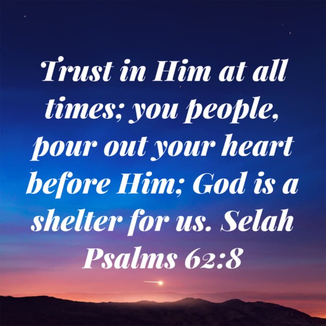 The answer to the question that I have posed is in the Scripture–ALL the time! When things are going well, when things are going badly, when you’re well, when you’re ill, basically always. When you pray, it’s okay to tell God that you are having problems with faith. In fact, I prayed this morning for God to help my unbelief. It’s not that I doubt the existence of God, but that just sometimes like many of you, I get discouraged. The pain in my body was overwhelming this morning; there were not enough ice packs to take care of all of it. Nevertheless, I arose, thanked God for a new day, and here I am with this Scripture verse that God gave me in my devotional this morning. Perhaps this verse is only for me, but I’m sharing it here just in case someone else out there in the blogosphere needs it. It’s okay to tell God exactly how you’re feeling because He already knows and provides a shelter for us in His loving arms. God is good…all the time. I repeat that mantra to myself frequently, sometimes to remind myself and sometimes as a praise to Him. I hope that you remember that God wants what is best for you, all the time. He is always there to answer, even when you may be like me and suffering and grumpy. It’s amazing to me that God never gets grumpy with me! Blessings, my friends, for a day that is filled with God’s goodness and a day of trust and amazement at God’s goodness to you!