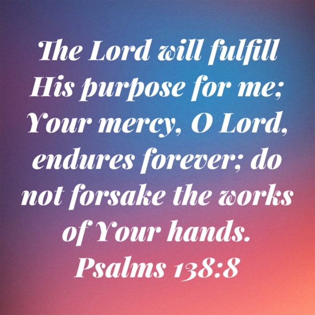 I’m still discovering daily God’s purpose for my life. Yes, I am old, but I truly believe that I’m still on earth because God isn’t finished with me yet. That has always meant to me that He is still perfecting me, helping me daily to become more like His Son Jesus. But, with today’s Scripture verse, I also think it means that God is still looking to use me here, to fulfill His purpose for me.