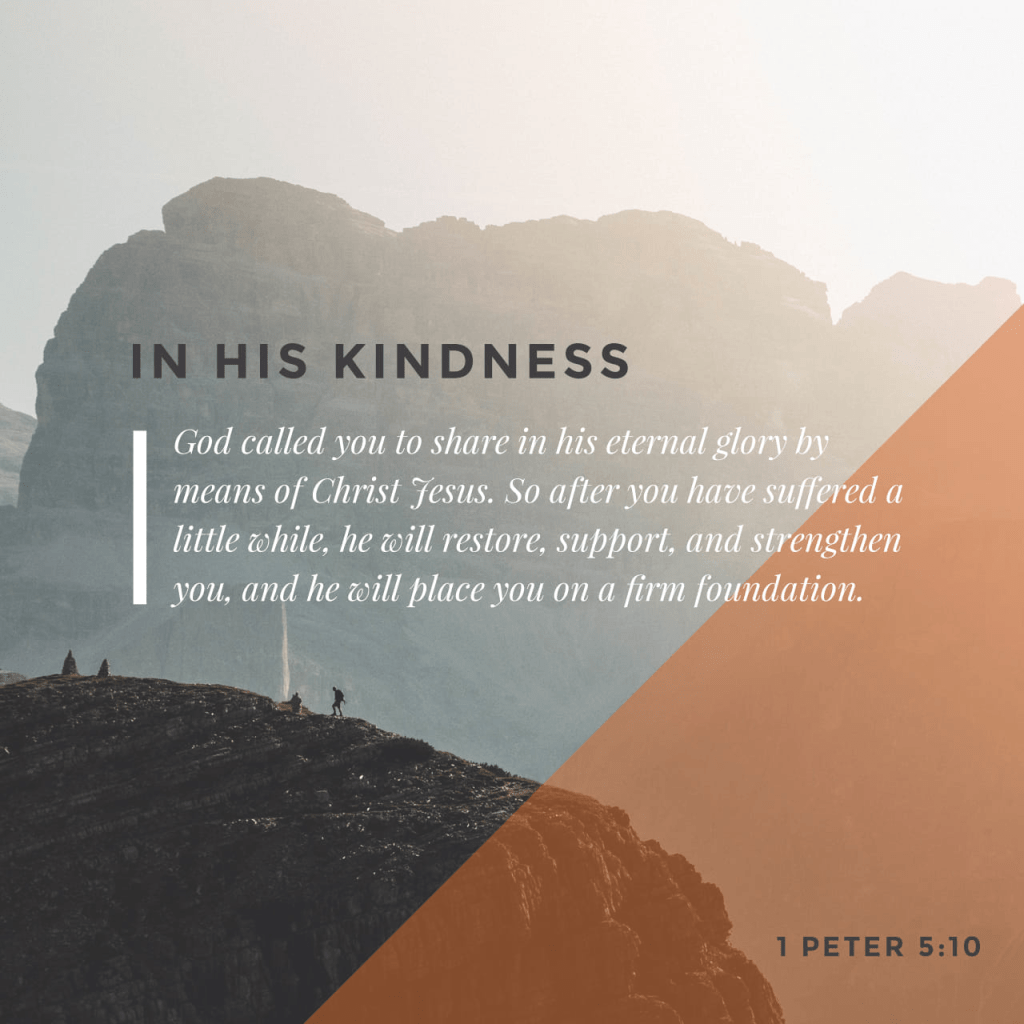 This is the first promise in my devotional this morning. I’m sure that I don’t like the suffering part, but Jesus suffered, so why should we think that we will escape all suffering? But look at the next sentence: AFTER you a suffered a LITTLE WHILE, He will RESTORE, SUPPORT and STRENGTHEN you….So, isn’t the suffering here on earth worth what is coming. God Himself will restore us, support us and strengthen us. We don’t have to worry about carrying all of that burden alone. Hallelujah!