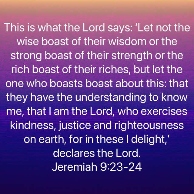 If you are going to boast, there is only one thing that is worthy to boast about and that is that you have the understanding to know the Lord. And, honestly, I don’t think you can really boast about that either unless you are using it as a testimony to the power of the Lord because even the understanding you have about Him as your Lord and Savior comes from Him. You haven’t done anything, you can’t do anything, and you don’t deserve anything…yet God in His great love and mercy reached out, opened your mind to understand Who He is and what He has done for you and even allows you to boast about having the understanding that He gave you. So, you have done a lot in your life to be proud of? Those crowns will one day be laid at the feet of Jesus, so you may as well begin practicing now by giving Him all of the glory for all that HE has done through you. It is freeing to be released from the burden of boasting, knowing that all comes from God and whatever you think you have done is a result of His power in your life. I could do nothing without Him and neither can you.