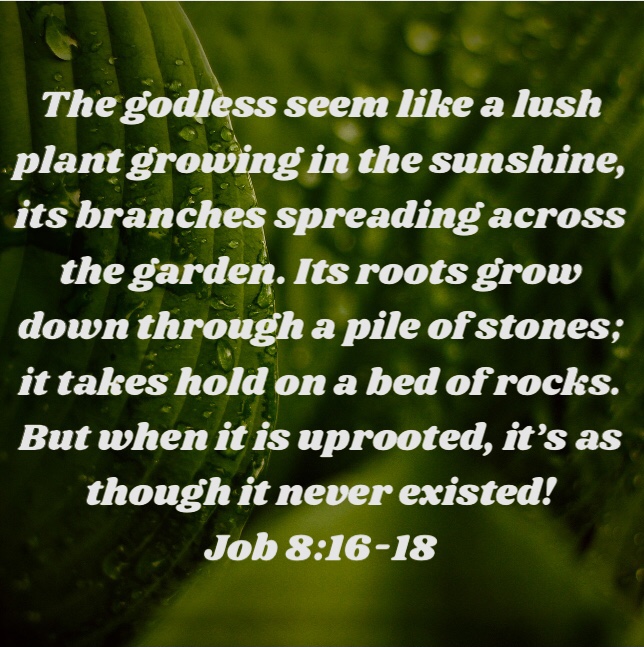 Notice that the verse says that the godless SEEM like a lush plant, thriving in the sunshine and spreading out. Just as the sinful seem to be doing, right? Their sin is spreading and becoming more acceptable. But look under the surface at what is really happening. Their roots are going down through stones, ending in a bed of rocks. They cannot survive there because they have no soil to feed and nourish them. The fate of the godless is to ultimately disappear. God looks, sees and is not concerned about their having a lasting effect on His kingdom because they will not be part of the eternity He has planned for those of us who believe. Rooted and grounded in His Word, we will stand and they will be as thought they never existed.
