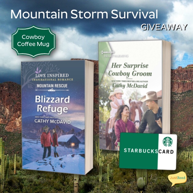 (2) winners will win a print copy of both Blizzard Refuge and Her Surprise Cowboy Groom, a $5 Starbucks gift card and a cowboy coffee mug!