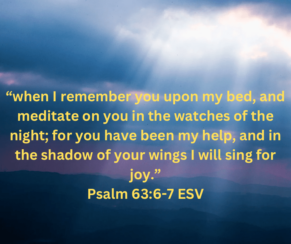We can sing for joy in spite of the problems, trials, or news stories that dismay us. God is right there, hovering over us, and protecting us from the things that threaten to overwhelm us and destroy our peace. If you remember, you had to pursue that other shadow and make an effort to stay within it in order to have your shadow hidden. Pursuit of God is the key to peace; meditating on His truths brings the help and joy that are so needed in order to rest in Him.