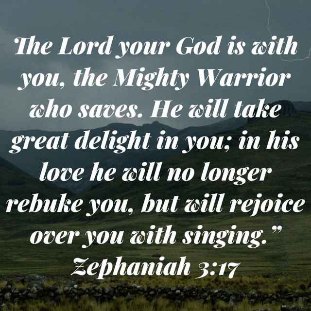 This is one of my favorite verses in Zephaniah. Personalize it and it will mean even more to you. “The Lord MY God is with ME, the Mighty Warrior who saves. He will take great delight in ME; in His love, He will no longer rebuke ME, but will rejoice over Me with singing.” I am not one who likes correction, but I am happy that God loves me enough to correct me and set me back on the right path when I stray. If I stay on the right path, He doesn’t need to “rebuke” or correct me, so I need to make right choices to stay on the straight and narrow and keep my focus on following the Lord. The result is amazing! God rejoices over us with singing! Can you imagine the heavenly choir all together singing a song of rejoicing because we are making right choices and delighting the Lord in going the right way? God rejoices over His children who delight Him with right choices. He gives us the ability to choose, but then He steps back and leaves our final decision to follow or to go our own way up to us. And when we choose to follow, He rejoices. Such is the great love of the Father. He is a Mighty Warrior, but He is also our Creator, our Father who loves us so much that He breaks out into song when we do what is right.