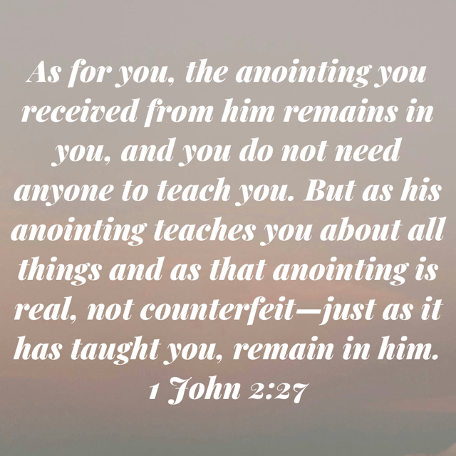 When I think of anointing, I think of the oil being poured on David as he was recognized as king. God had chosen him for a special position and made it clear to all who saw him that he was the anointed king of Israel. It is mind-boggling to think that we all who have accepted Christ as our Savior have also received an anointing, one that doesn’t get washed away with the next shampoo, but one that is there forever. God anointed us so that we could be taught the things of God, the spiritual things that we would have difficulty understanding otherwise.