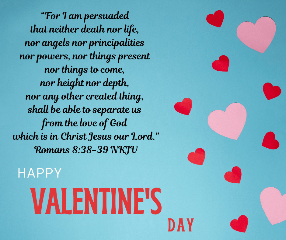 If today is a day that you are feeling lonely and unloved, remember this verse. Nothing can separate you from God’s love, ever! He is right there if you just reach out to Him and tell Him honestly that you need Him, today and everyday. Let Him show you what real love is all about. It’s not hearts and flowers and chocolates. Real love went to a cross and sacrificed Himself so that we can eternally be with the Father. It’s our choice to accept Jesus’s sacrifice, repent of our sins and live in the presence of His great love for us forever. Repentance just means telling God you are genuinely sorry for all you have done in your life that was wrong, sinful, disobedient. You don’t have to make a list. He knows. Just say with your whole heart that you are sorry. Then, you show Him you mean it by turning away from those things and starting a new life with Him. Find a good, Bible-believing church, talk to the pastor and tell him that you need a mentor to disciple you. Read your Bible every day and let God’s Word minister to you and grow you into the person He created you to be. Then you will know His love and that will sustain you through hard times, lonely times, heartbreak and health problems. God’s love is forever. So, give God your heart this Valentine’s Day. That’s all He wants is a relationship with you!