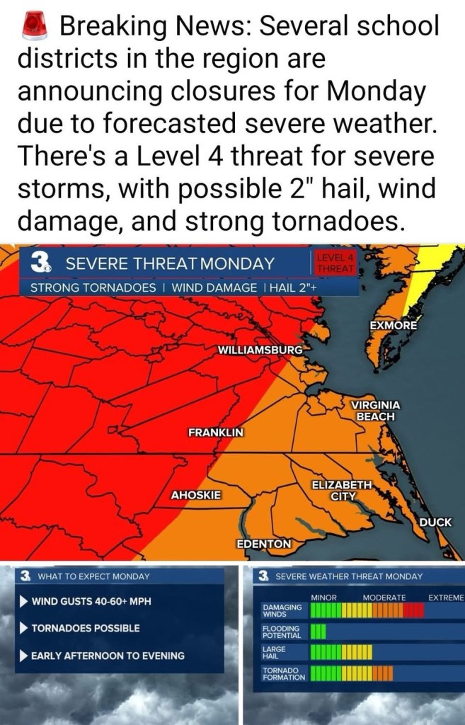 Our schools in our district are closed since the time for dismissal would be when the storm might hit. On the map, we are south of Williamsburg, somewhere between the orange and the red zones.