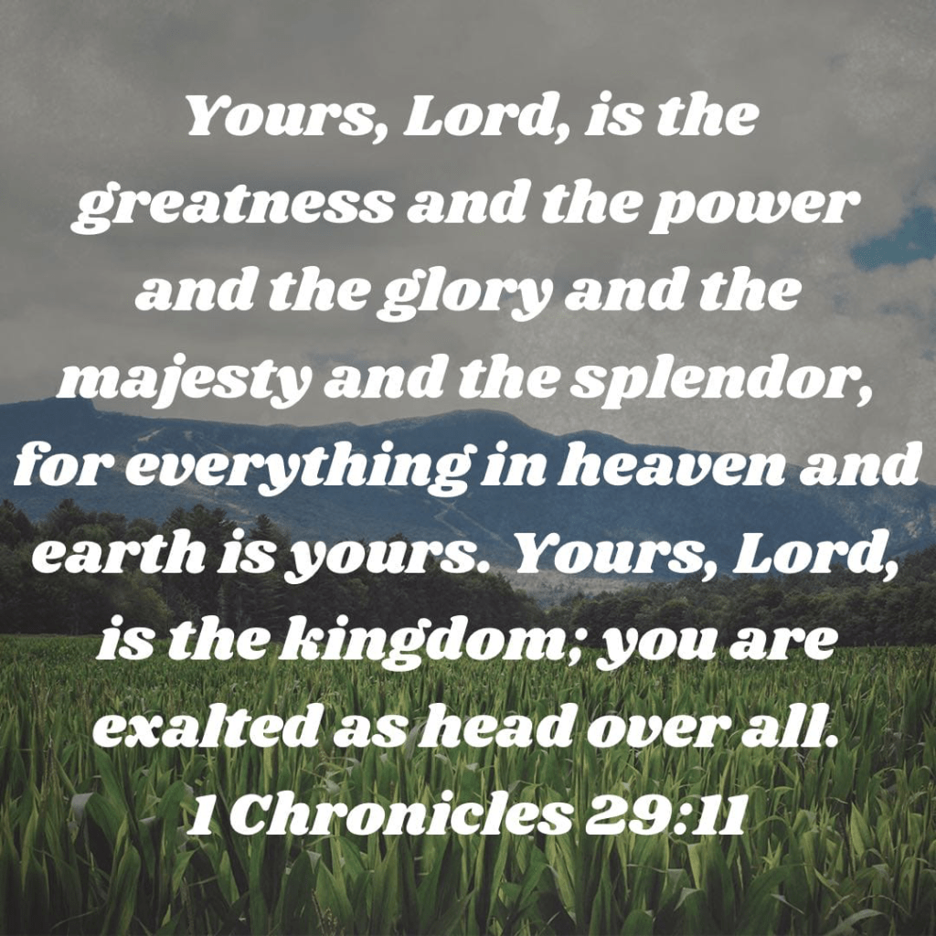 God is great, powerful, and glorious. Everything in heaven and on earth belongs to him. We sometimes deify leaders, thinking that they are more powerful than what they really are. God, the One true God, put them in a position of power and He can remove them at any time. He is head over all the kings, presidents, prime ministers and governors. We need to acknowledge God’s dominion and quit giving it to humans who would have no power unless He allows it.