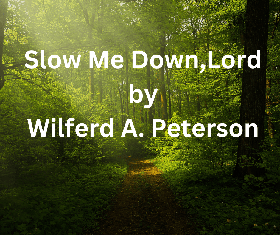 Slow me down, Lord! Ease the pounding of my heart By the quieting of my mind. Steady my harried pace With a vision of the eternal reach of time.