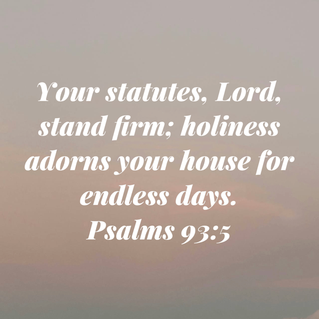 This Psalm ends with a reminder that God’s statutes (His laws and ordinances) always stand firm. He is always holy and His holiness is part of His dwelling place. That makes for some deep thinking because we are God’s temple, we are the dwelling place for His Holy Spirit, so within us remains the holiness of God. That makes me think and be in awe of how much God loves me, oftentimes in spite of me.