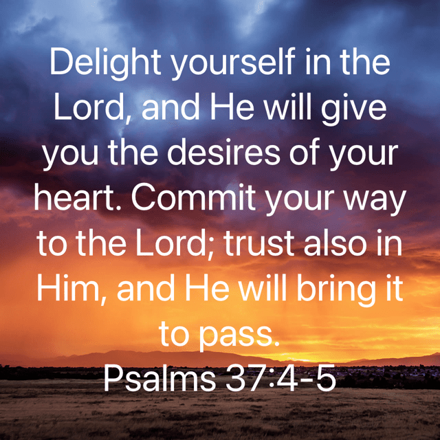 As a new Christian, when I read this verse, I was overjoyed with the thought that whatever I asked for, God would make it happen. Five decades later, I know that the verse is true but my heart had not yet been trained for what it really means. First of all, delight means extreme satisfaction or pleasure. Do you feel extreme pleasure in the presence of God? The second part of that sentence in the verse says God will give you the desires of your heart. The thing is, as I have grown closer to God, my desires have changed. The physical wants that I thought I one time I just had to obtain have been replaced with spiritual needs that I yearn for. My greatest desire is to be close to God and to hear His voice as I go through my day. Along with that is the desire to see loved ones in a relationship with our Father in Heaven. Does that mean that I have stopped wanting nice things? No, but they are no longer a priority.