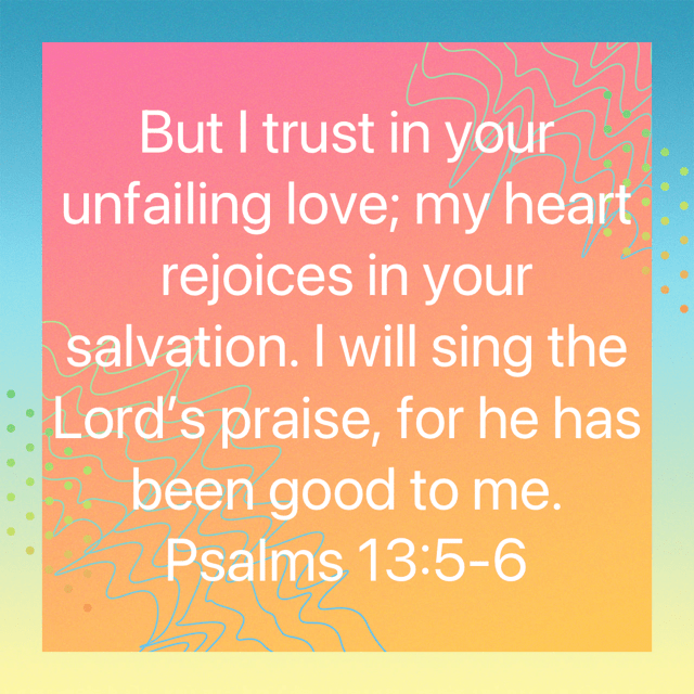 Notice what comes after the action verbs. Trust in your unfailing love. Rejoice in your salvation. Sing the Lord’s praise. Why do we trust, rejoice and sing? Because the Lord has been good to us. Every day that we live is a gift. Every breath that we take is from Him. Instead of bemoaning circumstances that we cannot change, let’s choose to trust, rejoice and sing!