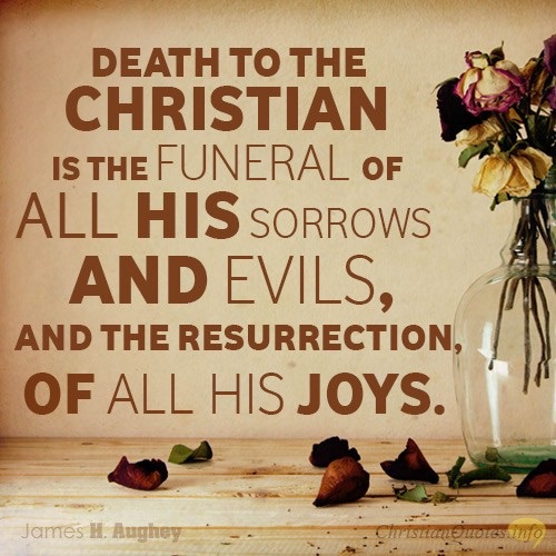 I like this graphic that I found online. It perfectly describes what death should be to each of us. Yes, we mourn, but as Paul said, we don’t mourn as the world mourns because we know death is a new beginning, not a complete ending. I don’t know what Heaven is like or the experience of death, but I do trust the Father to be with me when I die and that He has prepared a place for me to be with Him. After all, He promised and He always keeps His promises. (Numbers 23:19)