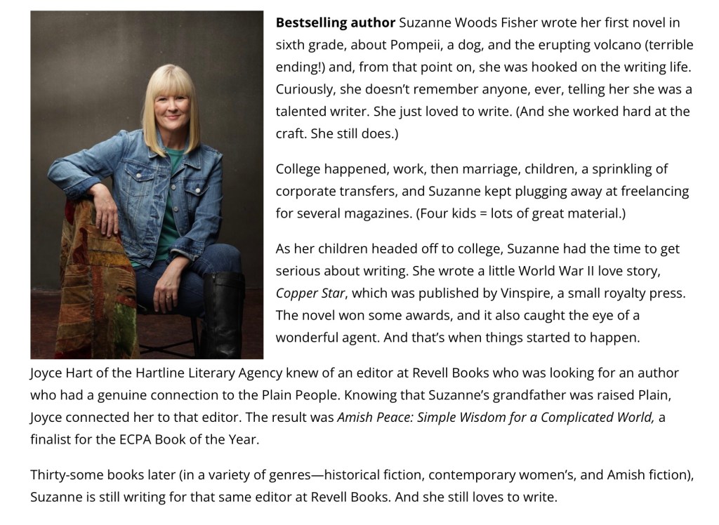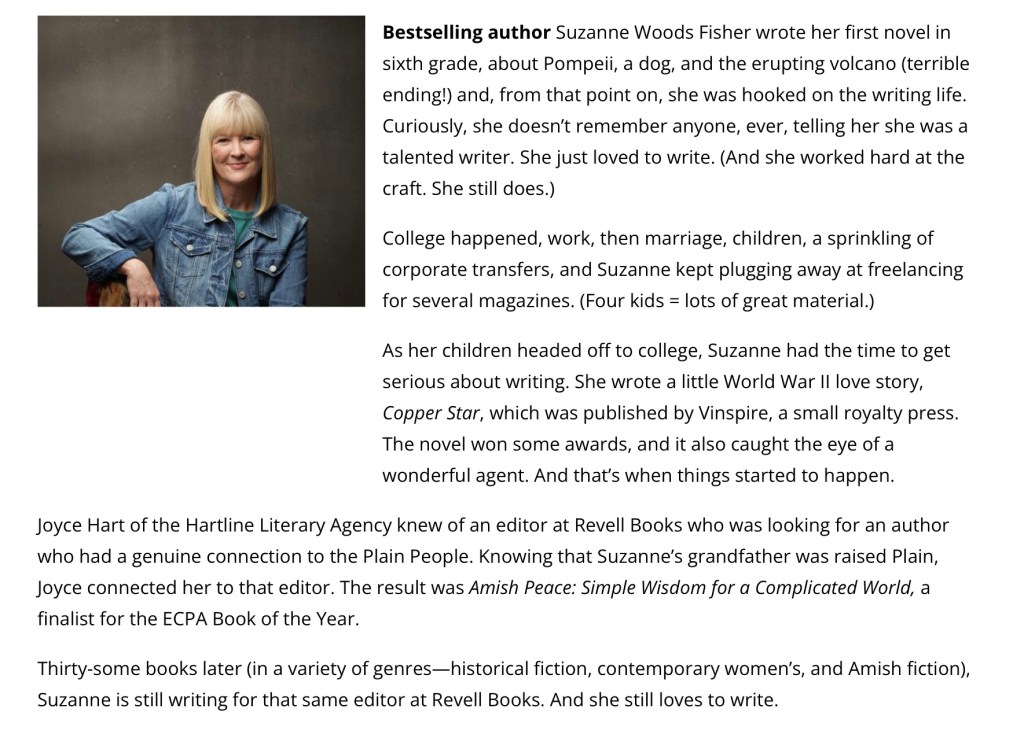 Joyce Hart of the Hartline Literary Agency knew of an editor at Revell Books who was looking for an author who had a genuine connection to the Plain People. Knowing that Suzanne’s grandfather was raised Plain, Joyce connected her to that editor. The result was Amish Peace: Simple Wisdom for a Complicated World, a finalist for the ECPA Book of the Year.