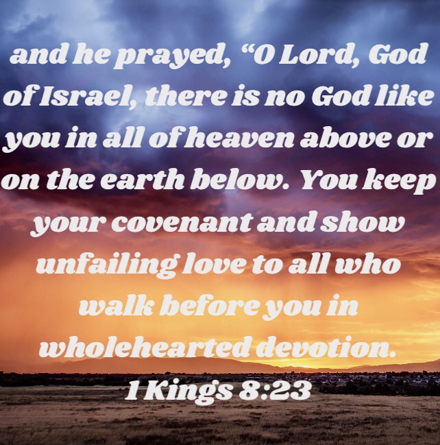 Solomon, the king with hundreds of wives and concubines, the man who formed ungodly alliances for the sake of peace in his land and the man who penned the book of Ecclesiastes, knew without a doubt that God is the Lord of all. He knew that God makes and keeps His covenant with mankind. The part that touched me the most was that God’s love never fails. I have failed and I may do so again, but God’s love has never left me. My desire is to walk with the Lord with wholehearted devotion, but sometimes I fall short. Praise be to God that He never falls short, always loves and always sticks around waiting for me to straighten myself out! Truly, there is only One God worthy of our praise, our adoration and our total allegiance!