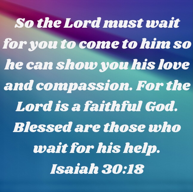 God truly desires to show us His love and compassion, but He is waiting patiently for us to come to Him and admit that we have a need. Knowing that God is a faithful God, once we take our needs before Him, then we must wait. But we know for absolutely certain that God’s help is on the way. It may not be what we expected but it will always be just what we needed just when we needed it.