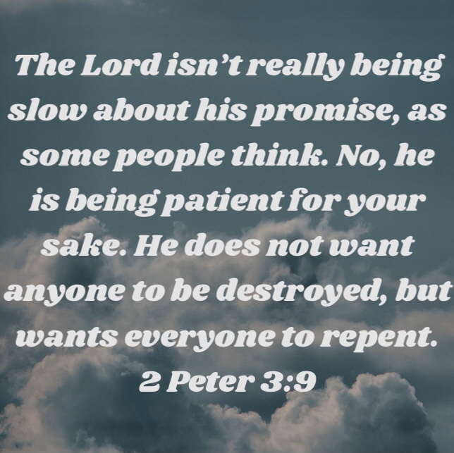 So while we wait impatiently, demanding that God do something about the condition of the world and all the rampant sin, God is patiently waiting for more to repent so that they don’t face eternal destruction. I’m thankful that God is patient, aren’t you? He patiently waited for me and there are others He is calling to, others who need to come and confess and repent. God is a God of justice, but He is also One of love and He wants the best for all of us, not just a few. Although waiting is hard sometimes, it will be worth it when we see God and all the souls He has saved worshipping Him around His throne. While we wait, our task is to tell others about His love, sharing our testimony and the difference He has made in our lives. Each one tell others…until He returns triumphantly to take us home.