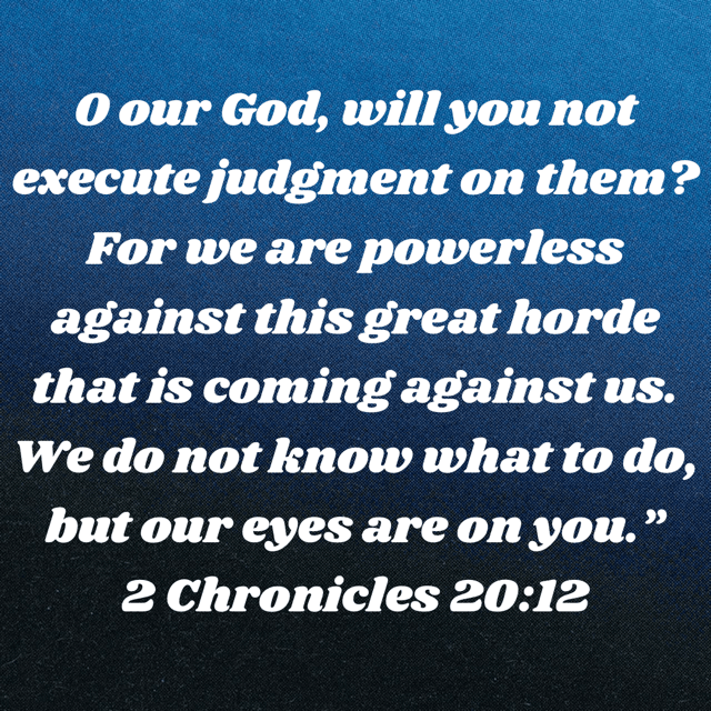 What is the solution? Jehoshaphat offers that as the verse continues. We need to admit that we don’t know what to do. Confess to God that we have done all that we know how in our finite minds and yet still we are beset by the enemy and feeling that defeat may be coming. Then, we just have to be still and keep our eyes on God. Jehoshaphat did not say, “Okay, let’s gather a large army against them and all of our best weapons. “ No, he waited and kept his eyes on God. If you open II Chronicles 20 and read it for yourself, it says:
